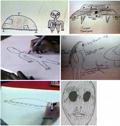 These pictures wer drawn by several students from various age ranges who witnessed something other worldly. Why would 62 kids lie, and how do they all have the same story? Most of the pictures they drew were too similiar for coincedence. Their stories never wavered or flawed from one another. The teacher does discipline by force of a bamboo cane on any student who lies or behaves negatively. The teacher himself stated my students do not lie. These kids said that when they looked at their eyes this thought just popped in their heads.."You are ruining your planet and something dire will happen.